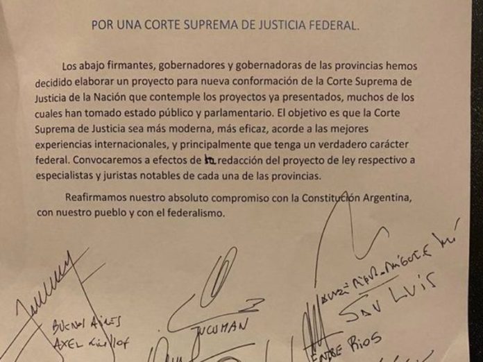 El texto indica: “Los abajo firmantes, gobernadores y gobernadoras de las provincias, hemos decidido elaborar un proyecto para nueva conformación de la Corte Suprema de Justicia de la Nación que contemple los proyectos ya presentados, muchos de los cuales han tomado estado público y parlamentario”.