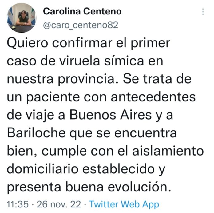 “Quiero confirmar el primer caso de viruela símica en nuestra provincia. Se trata de un paciente con antecedentes de viaje a Buenos Aires y a Bariloche que se encuentra bien, cumple con el aislamiento domiciliario establecido y presenta buena evolución”, publicó la funcionaria en su cuenta de la red social Twitter.
