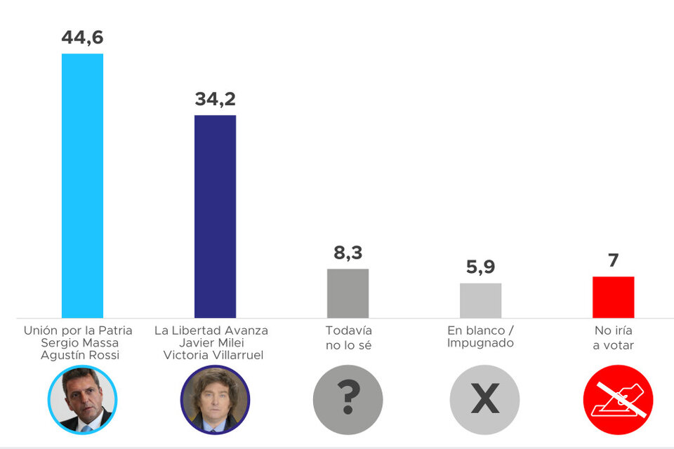 Como era de esperar, la primera encuesta nacional realizada sobre el balotaje le da una cómoda ventaja a Sergio Massa. El candidato de Unión por la Patria (UxP) reúne el 44 por ciento de los votos, contra el 34 por ciento de Javier Milei de La Libertad Avanza (LLA).