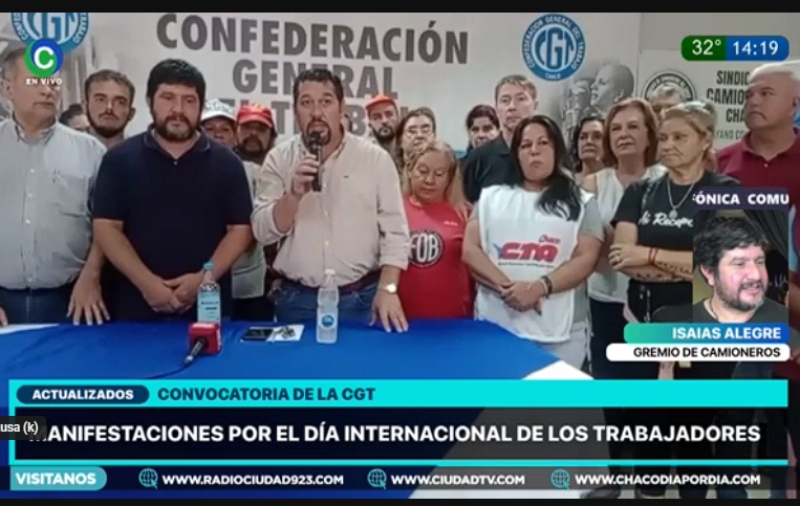El secretario General de la delegación chaqueña de la CGT, Isaías Alegre, encabezó este martes, junto a su par, Adrián Bellomi, la conferencia de prensa que se realizó en la sede de la central obrera con referentes gremiales y de organizaciones de distintos sectores de trabajadores, previo a la movilización y acto de este 1° de Mayo.