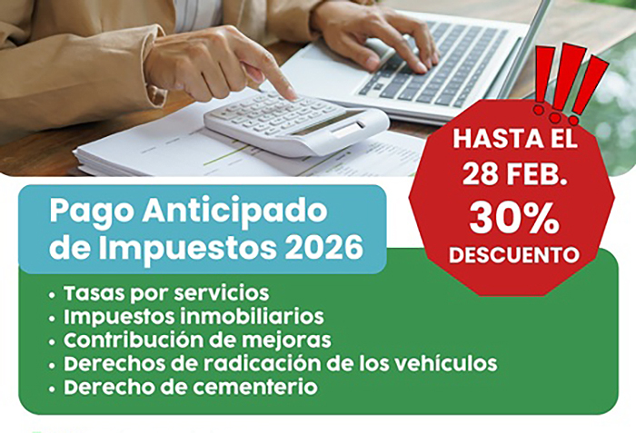 El Municipio de la Ciudad Termal, a través de la Secretaría de Economía, recuerda que hasta el 28 de febrero se podrá acceder al Pago Anticipado de Impuestos 2026, una medida que permite a los contribuyentes obtener un 30% de descuento.