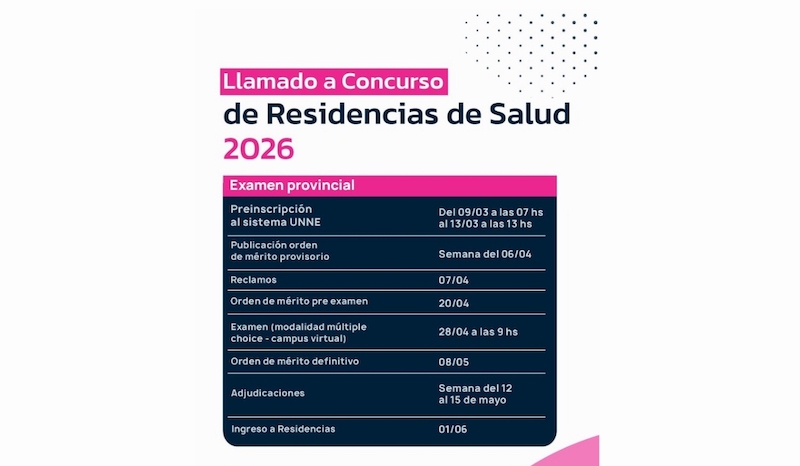 En el marco de un convenio entre los Ministerios de Salud de Chaco y Corrientes, a través de la Facultad de Medicina de la Universidad Nacional del Nordeste (UNNE), se lanzó la preinscripción online para el primer llamado al Concurso Provincial de Residencias en Salud, destinado a profesionales que aspiren a ingresar al sistema de residencias en instituciones públicas de ambas provincias.