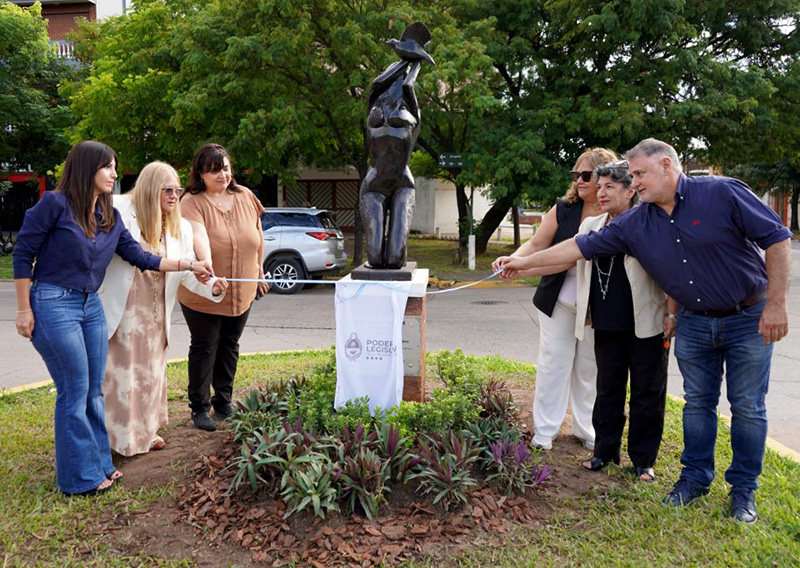 Frente a la escultura donada por la Comisión Provincial Multisectorial de la Mujer, se descubrió una placa conmemorativa que sirve como recordatorio permanente de las mujeres que perdieron la vida a causa de la violencia.