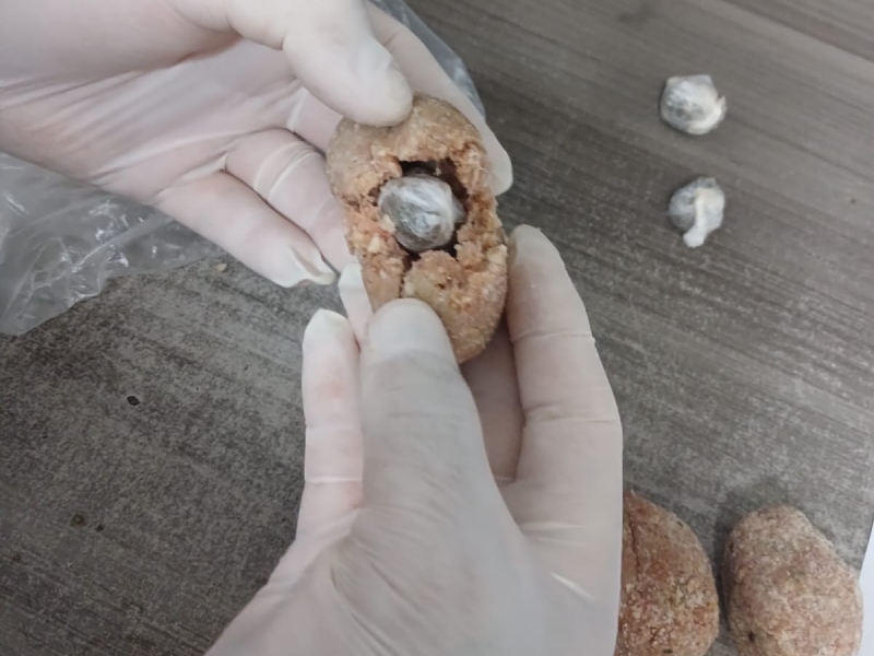 Durante el control de alimentos entregados por una mujer, el personal policial detectó cuatro envoltorios con sustancia vegetal escondidos en albóndigas. Ante ello se dio intervención a la División Drogas, que realizó la prueba de campo correspondiente.