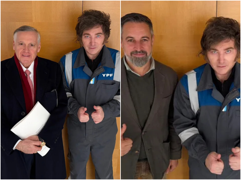 A su vez, el mandatario, vestido con su habitual mameluco de YPF, se reunió con el empresario Martín Varsavsky y su esposa, Nina Varsavsky.