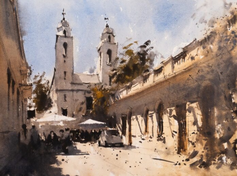 Las acuarelas de Canteros se sitúan en ese umbral donde la precisión del dibujo arquitectónico se encuentra con la atmósfera etérea del agua y el color, luces y sombras. Iglesias, capillas, oratorios y espacios de recogimiento emergen desde una mirada que no busca la representación literal, sino la evocación de lo intangible: la luz, la quietud del aire, la presencia humana frente a lo trascendente, lo sagrado.