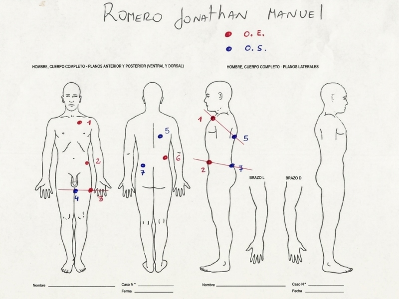 Además del disparo letal, el informe describe un impacto en el abdomen que atravesó el cuerpo sin comprometer órganos vitales; un disparo en el muslo izquierdo, también con entrada y salida y un proyectil que ingresó por la zona lumbar derecha y quedó alojado en los músculos paravertebrales.