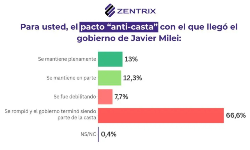 En concreto, según el relevamiento, el 66,6% de los consultados considera que el “pacto ‘anticasta’” de Milei “se rompió y el gobierno terminó siendo parte de la casta”, una cifra ampliamente mayoritaria que muestra desgaste en uno de los ejes identitarios del oficialismo.